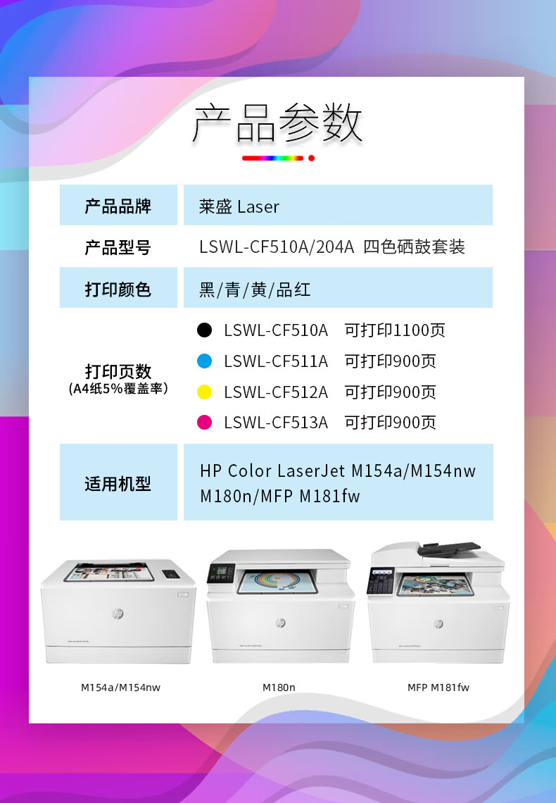 莱盛CF510A/204A黑青黄红四色硒鼓套装 适用HP LaserJet Pro M154a M154nw M180n M181fw MFP打印机粉盒 自营