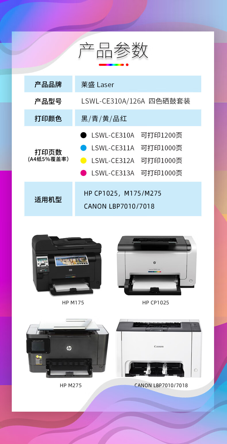 莱盛CE310A/126A彩色硒鼓四色套装 适用惠普HP CP1025nw M175A 175nw M275佳能CANON LBP7010 7018打印机粉盒 自营