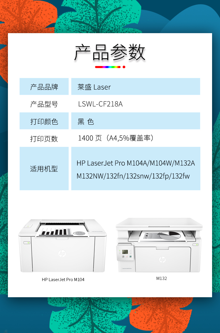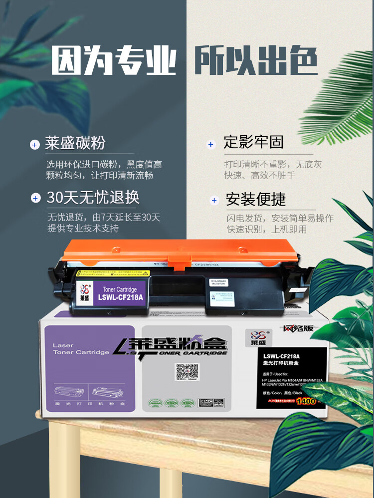 莱盛CF218A粉盒带芯片 适用于惠普 HP M104A M104W M132A M132NW 132fn 132snw 132fp 132fw打印机墨盒 自营